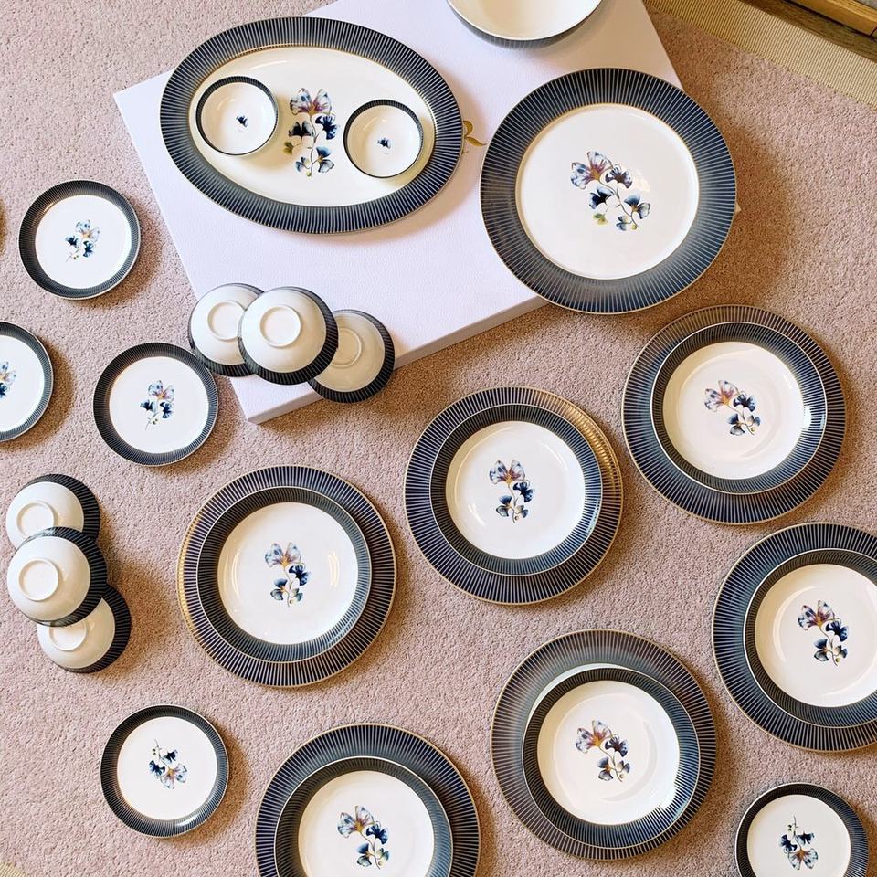 Nuevo Diseño Europeo, Juego de Vajilla de Porcelana Fina con Patrón de Ginkgo Azul