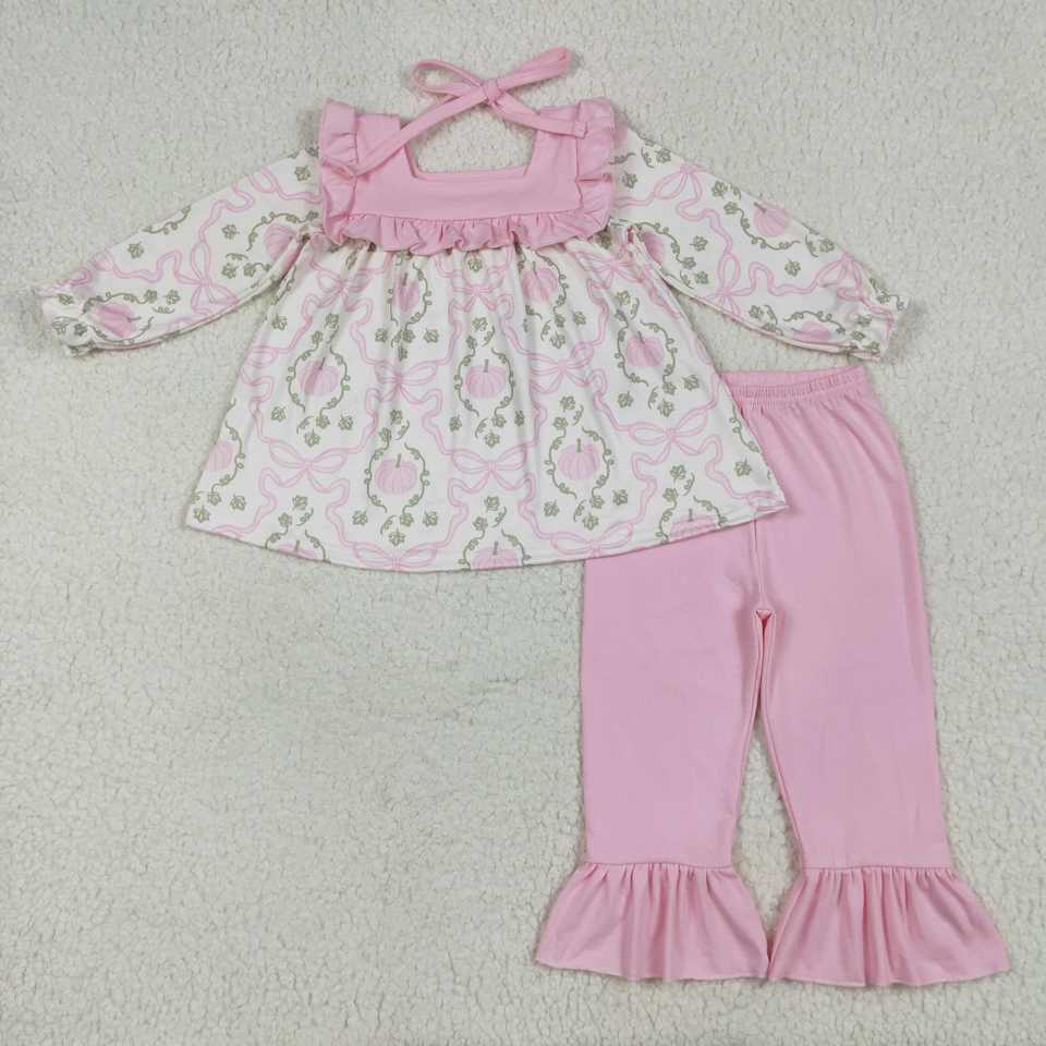 Nuevo diseño de estilo otoñal para niñas, venta al por mayor, listo para enviar, mameluco de manga larga con estampado de calabazas para bebés recién nacidos con volantes