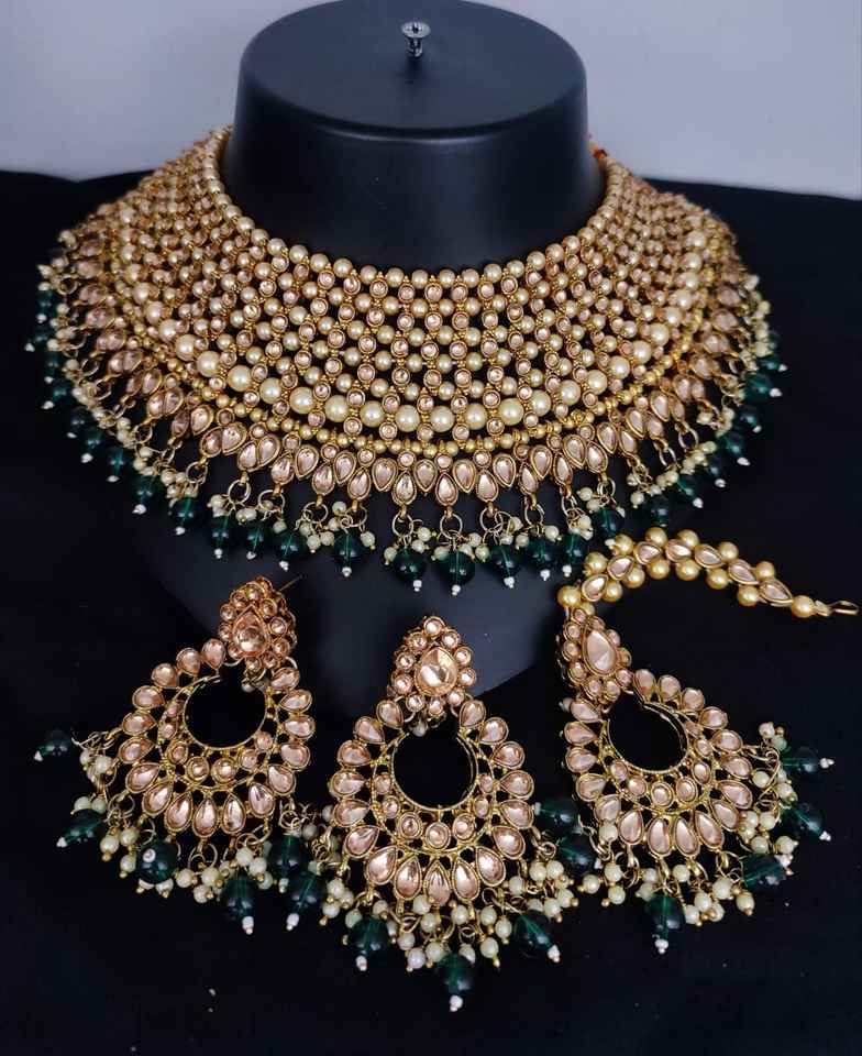 Green Pearl & Kundan tachonado collar conjunto de joyas