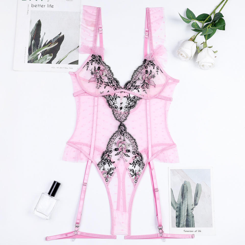 Conjunto de Lencería Transparente con Bordado Floral de Nuevo Diseño, Conjunto de Ropa Interior Sexy para Mujer