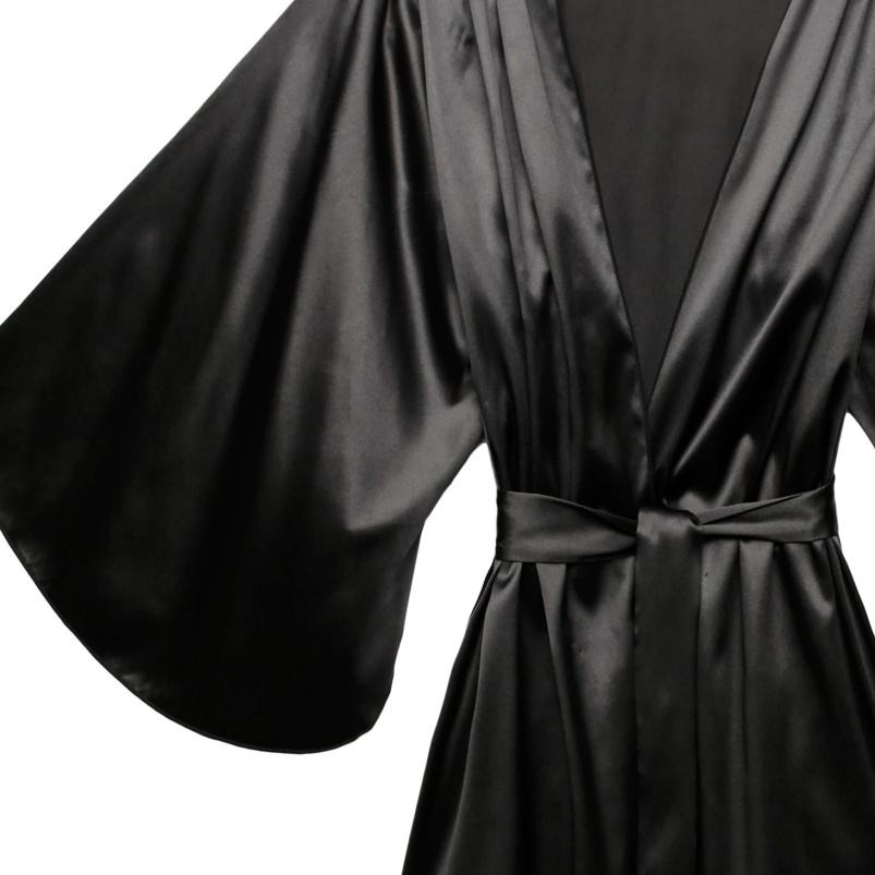 Nuevo diseño de Bata de seda para mujer, lujosa ropa de dormir de satén negro, bata de seda de manga ancha