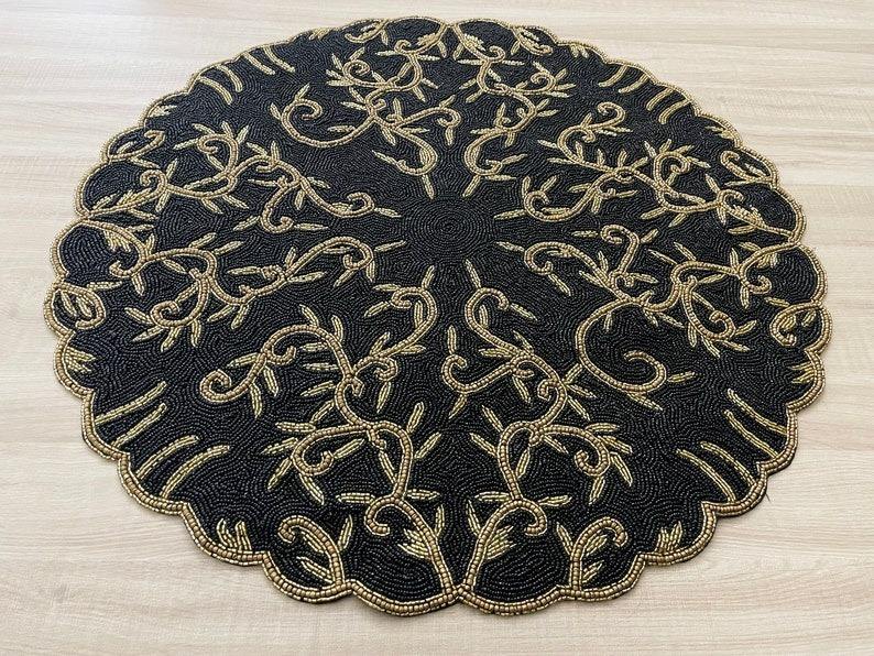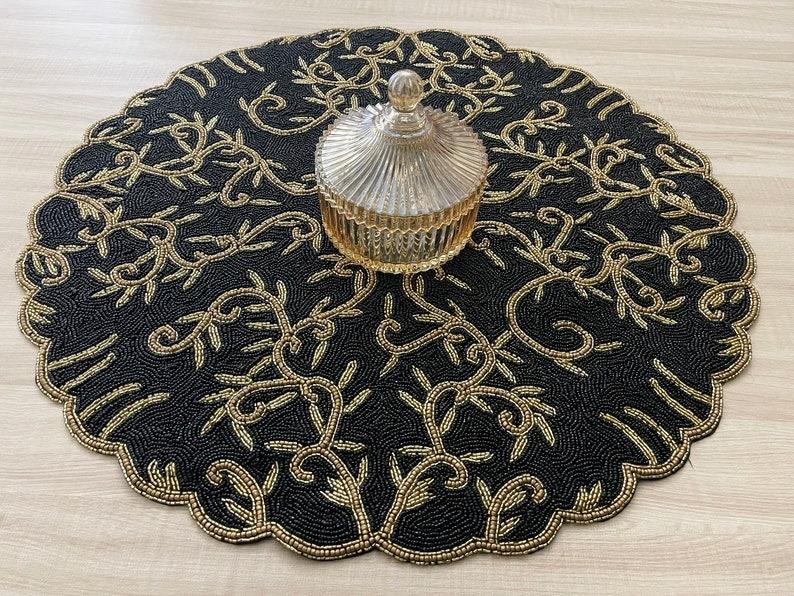 Juego de 4 Manteles Individuales/Posavasos Bordados de Lujo con Cuentas Blancas, Resistentes al Calor para Uso Doméstico, Tono Negro Dorado
