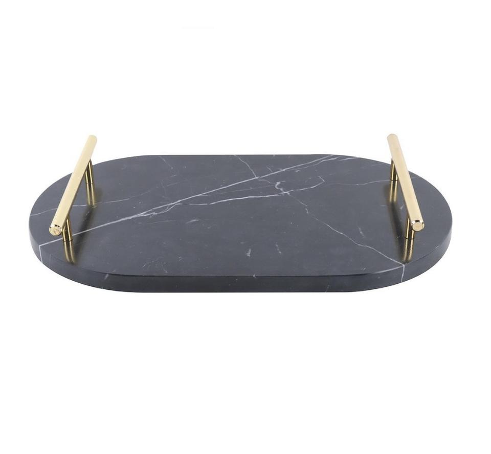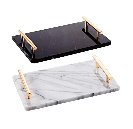 Bandeja de servicio de mármol de nuevo diseño para restaurante de hotel en casa Plato de servicio Color blanco Mango dorado Bandeja de mármol de tamaño personalizado.