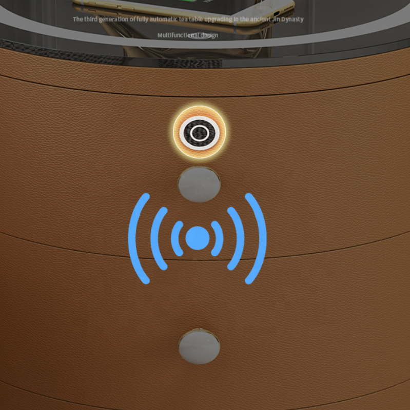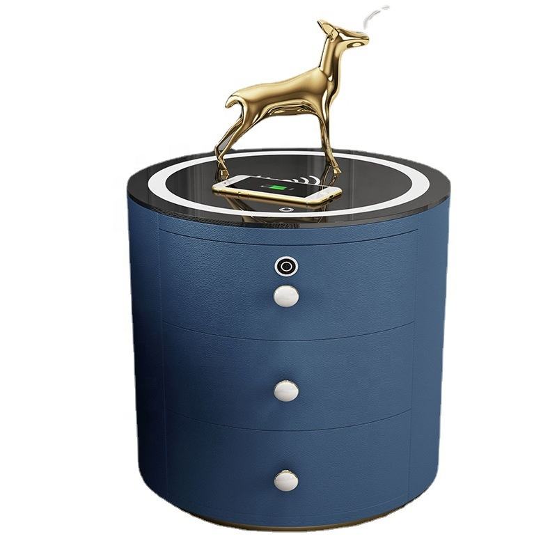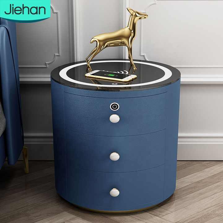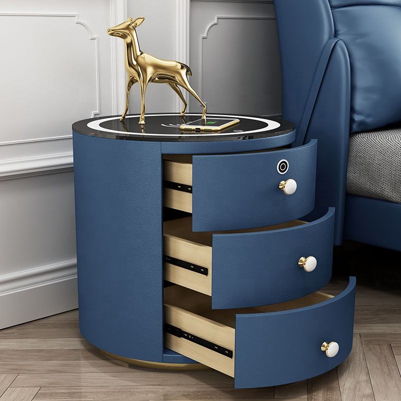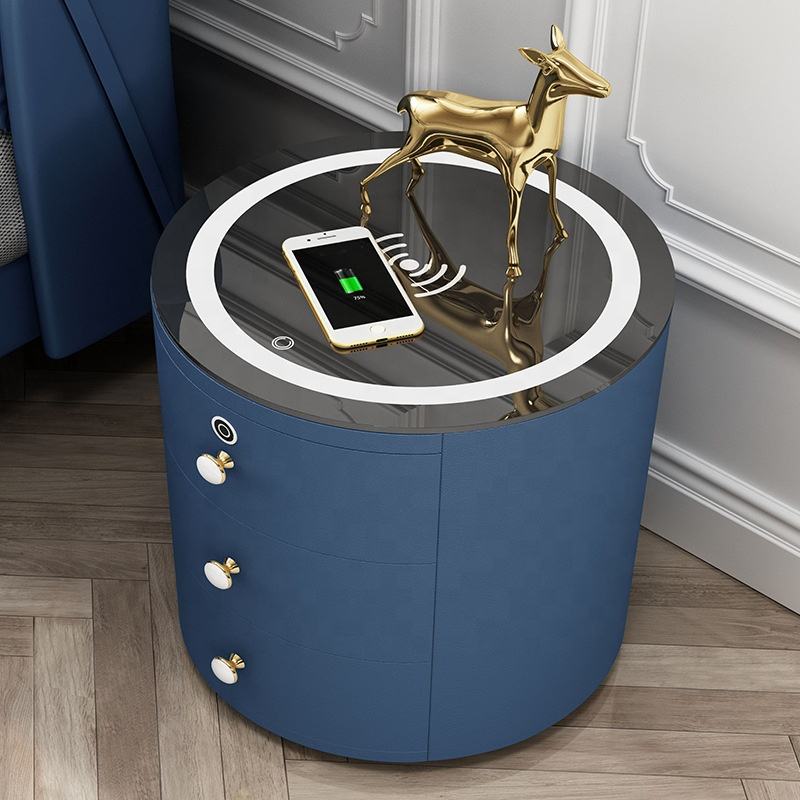 Mesita de noche redonda inteligente con luz led, mueble de dormitorio con carga inalámbrica, de cuero, nuevo diseño