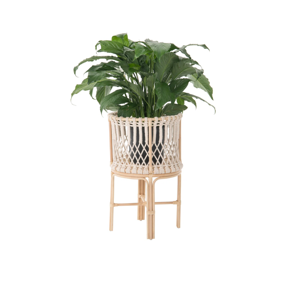 Rattan Planter Stand with Handmade White Cotton Rope Macrame