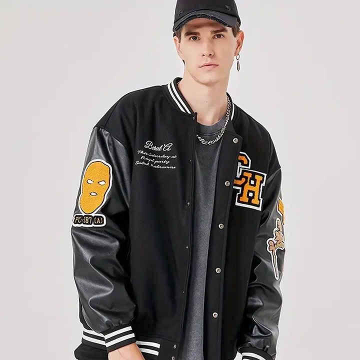 Chaqueta de béisbol de color negro sólido de nuevo diseño para hombre, chaqueta universitaria de talla grande con manga de cuero de tela transpirable para uso universitario