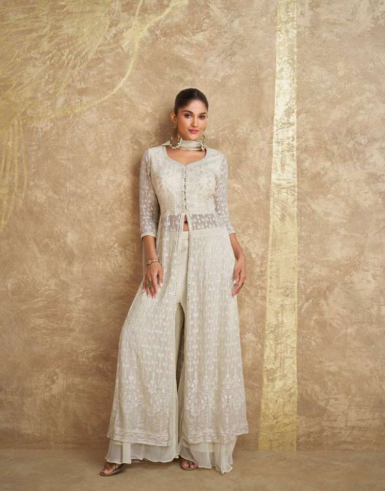 Nombre del producto:Vestido bordado Georgette con conjunto de Palazzo y Dupatta