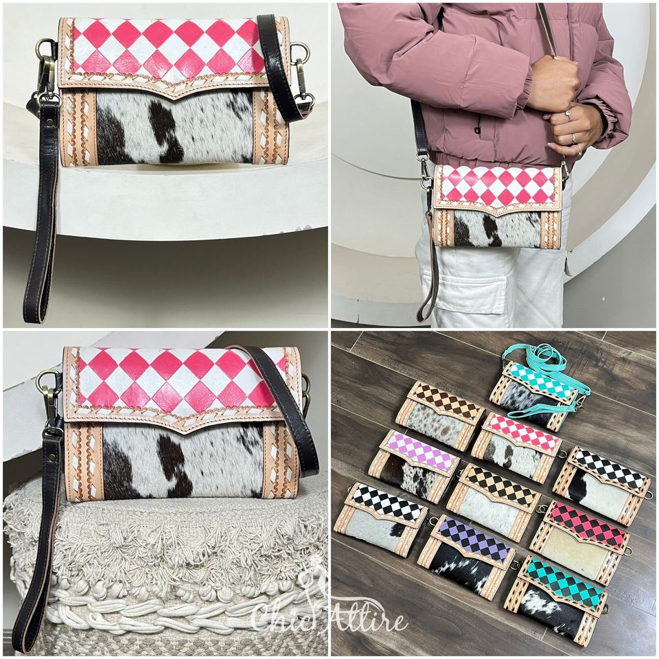 Nuevo Bolso de Mano Tipo Clutch Mini con Correa Cruzada, Diseño de Cuero Vacuno a Cuadros Rosa y Blanco, Hecho a Mano en Estilo Western