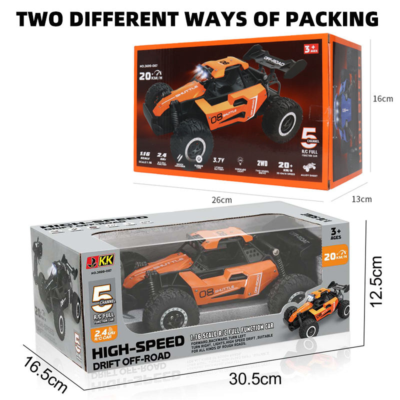 Construcción de Metal y Plástico: La combinación de materiales metálicos y plásticos asegura una estructura robusta y duradera, lo que hace que el coche a control remoto sea adecuado para uso tanto en interiores como en exteriores.