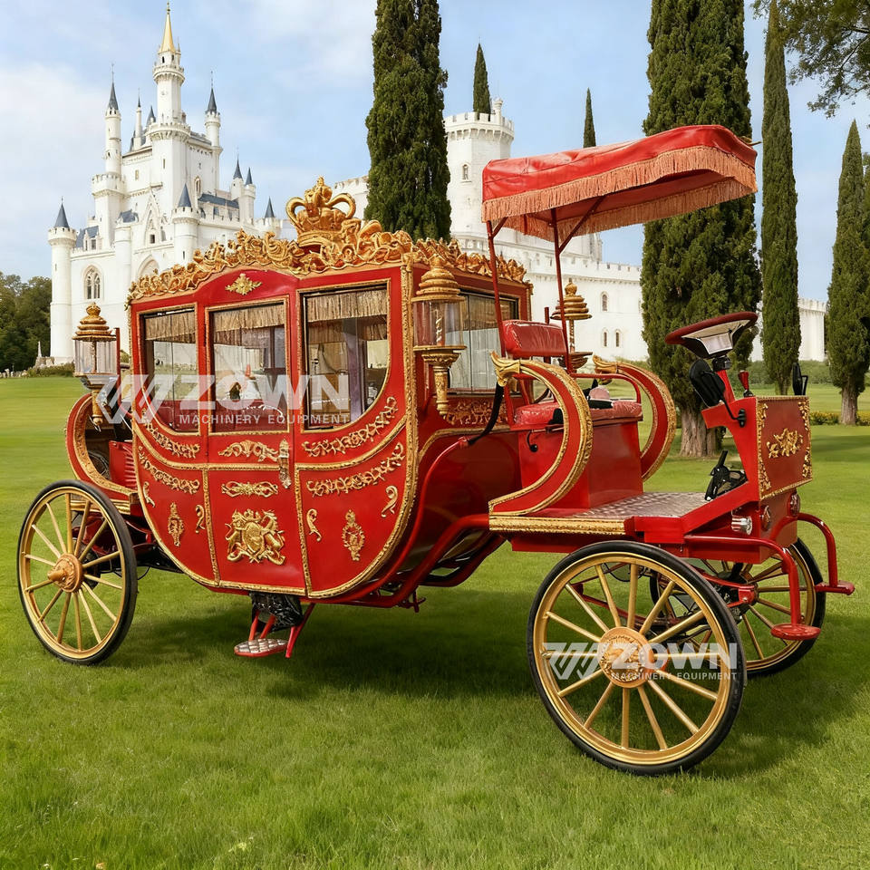 Nuevo carruaje real esculpido estilo boda eléctrico, carruaje turístico de cuatro ruedas con tira de luces LED, rojo real