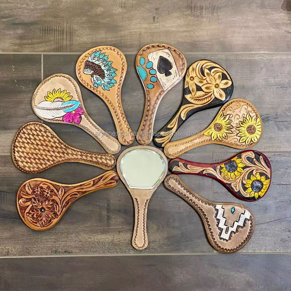 Type:Western Engraved Tooled Leather Handheld Mirror