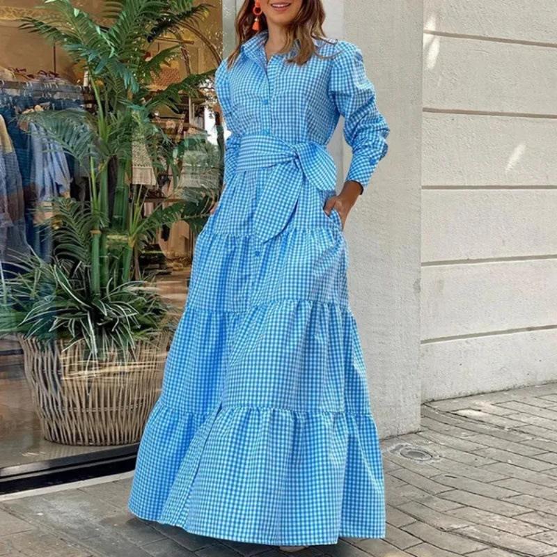 Nuevo vestido forrado a cuadros de primavera/verano europeo y americano con cuello abatible, mangas largas, vestido de columpio grande