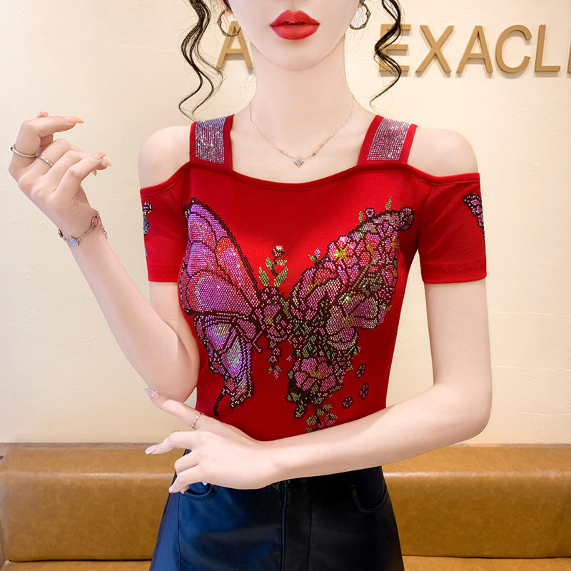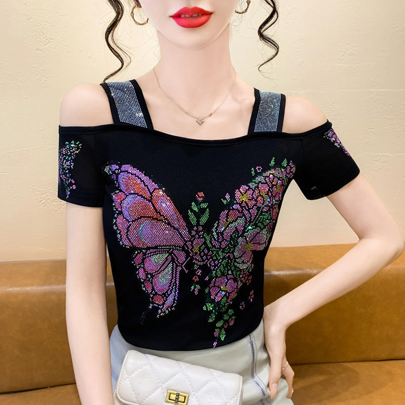 Nueva Blusa Elegante de Doble Capa con Pedrería y Malla de Seda Helada, Manga Corta, Hombros Descubiertos y Espalda con Diseño Atractivo