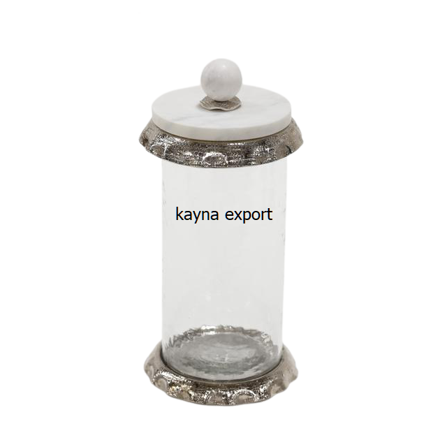 Recipiente de vidrio con tapa de metal de diseño elegante para almacenamiento de cocina, recipiente de vidrio de lujo con flor de metal disponible al mejor precio
