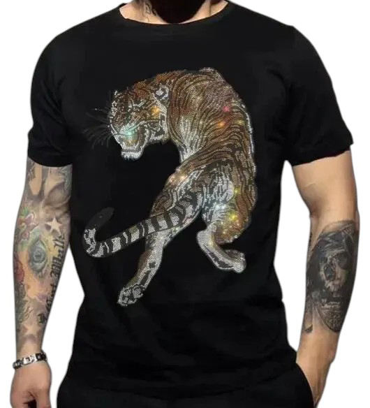 Nueva camiseta de moda para hombre con diseño de tigre y diamantes de imitación, diseño de animales con cristales brillantes, camiseta transpirable de manga corta para fiestas y moda