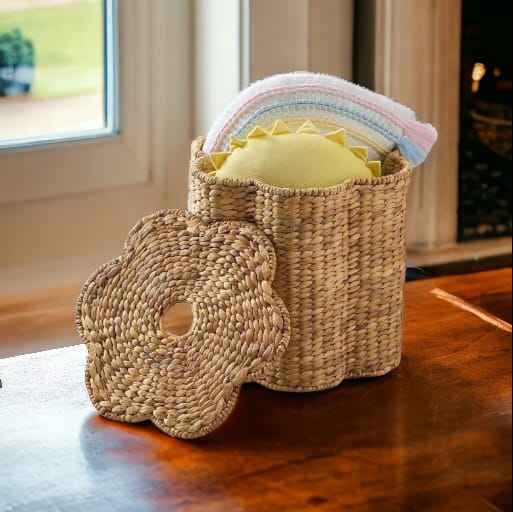 Palabra clave:Cesta redondeada de almacenamiento de mimbre festoneado