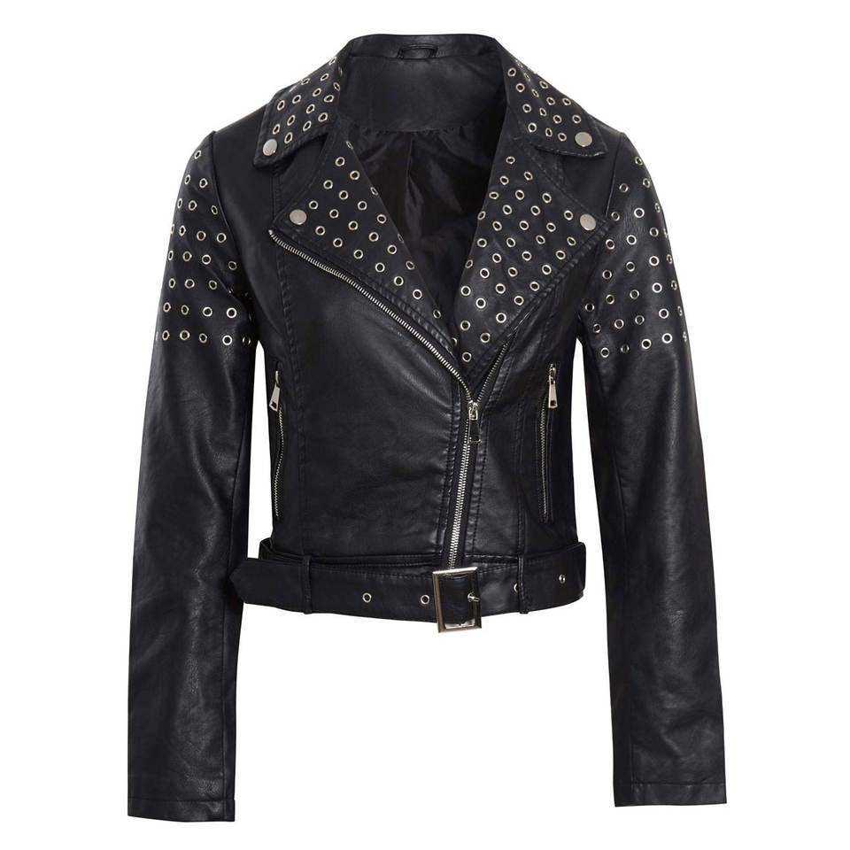 Chaqueta de Cuero Auténtico Negra de Motociclista con Tachuelas Estilo Punk Corta para Mujer, Nueva Moda al por Mayor