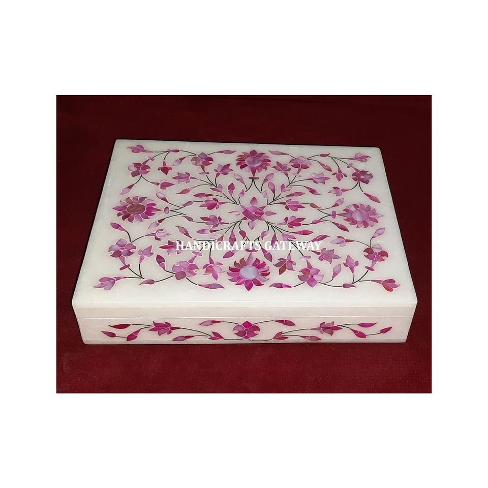 Nuevo diseño de flores, incrustaciones de mármol blanco, joyero de nácar rosa para decoraciones de boda y fines de regalo
