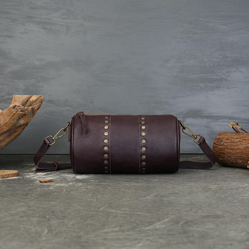 Nuevo bolso cilíndrico con tachuelas de cuero genuino, bolso de hombro tipo bandolera de grano superior curtido vegetal Retro para mujer