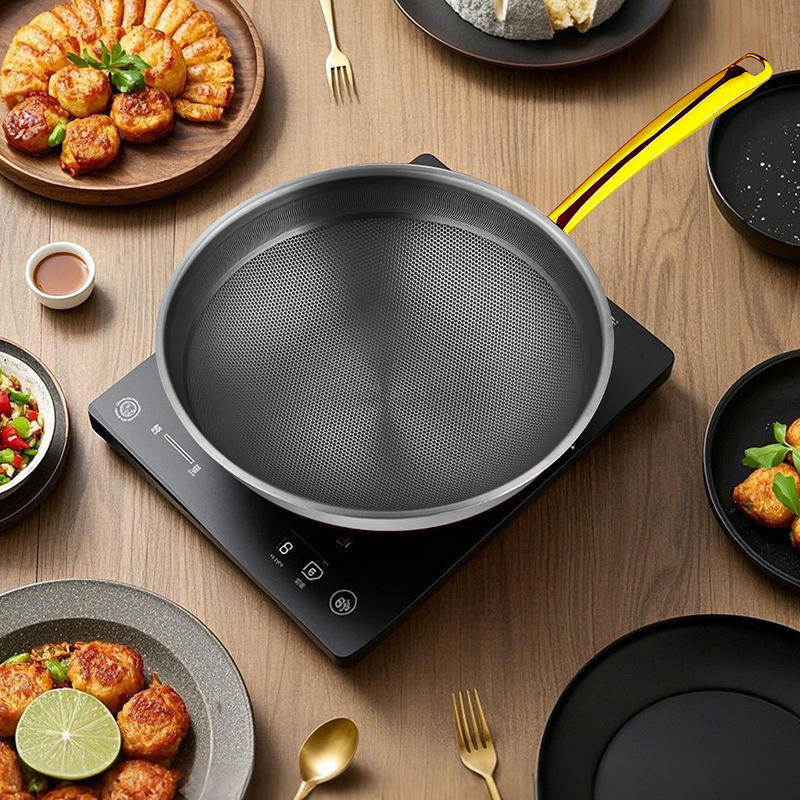 Nuevo Wok Sostenible con Asa Dorada, Interior de Titanio Puro con Diseño de Panal, Tapa de Vidrio Templado sin Recubrimiento, para Uso Doméstico Clásico