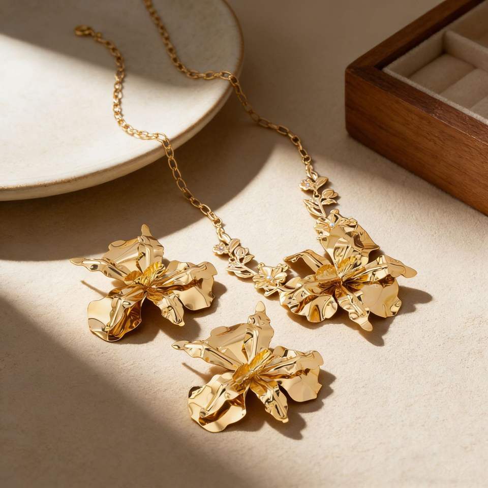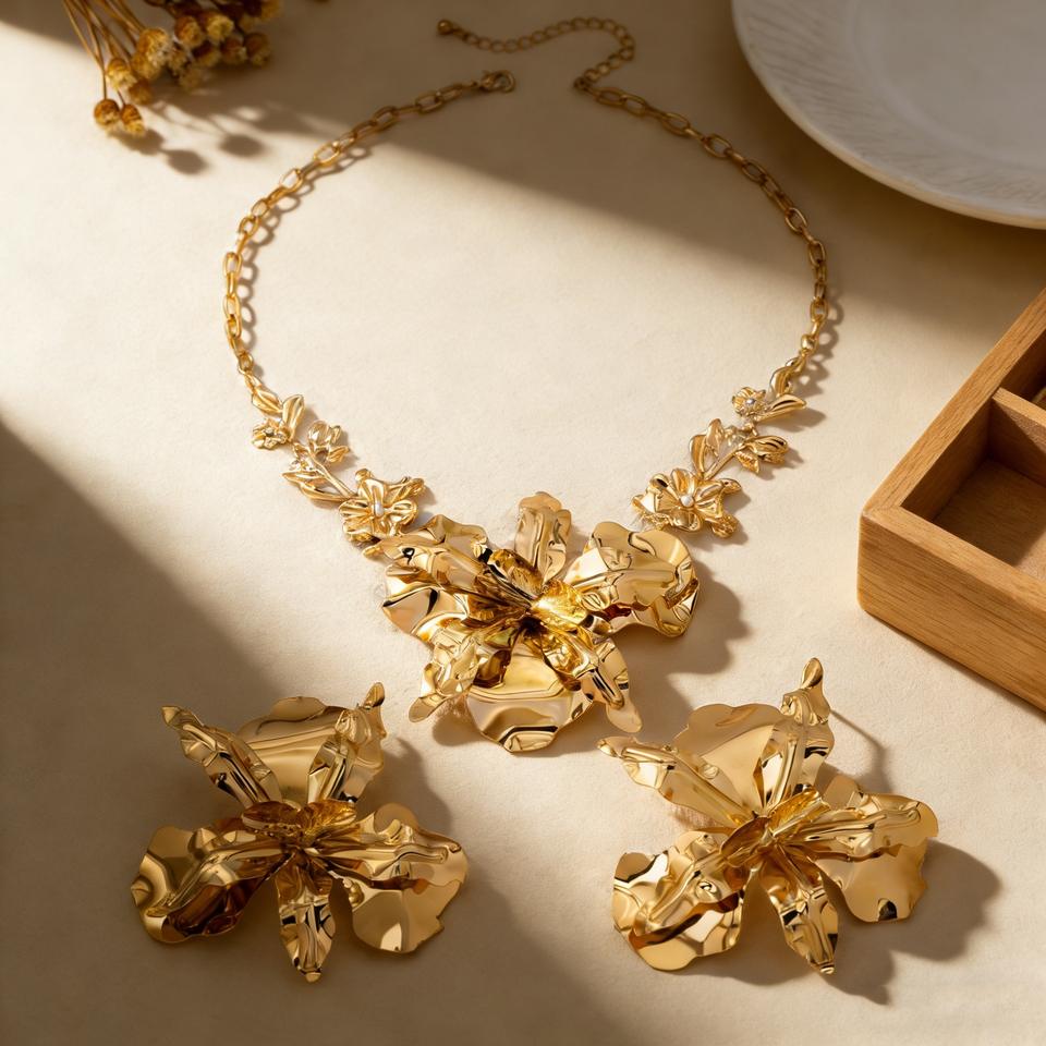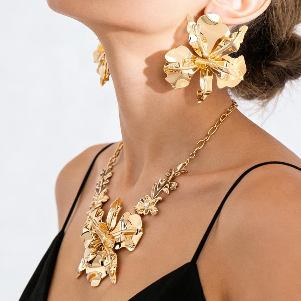 Nuevo Conjunto de Collar y Pendientes de Flor Grande Exagerada en Aleación Chapada en Oro, Joyería de Lujo para Mujer, Ideal para Fiestas Nocturnas