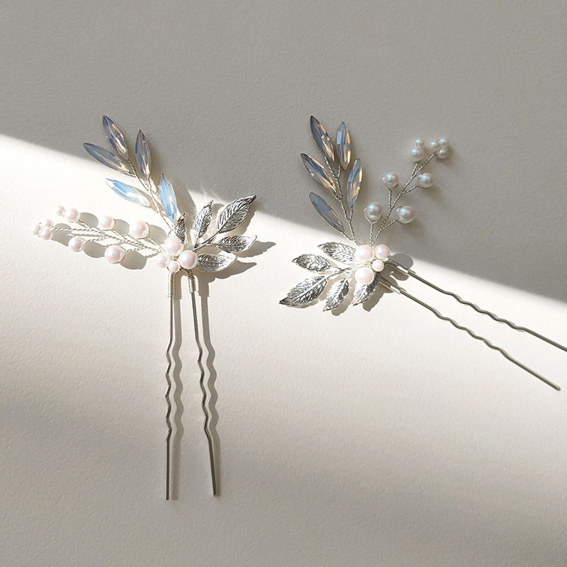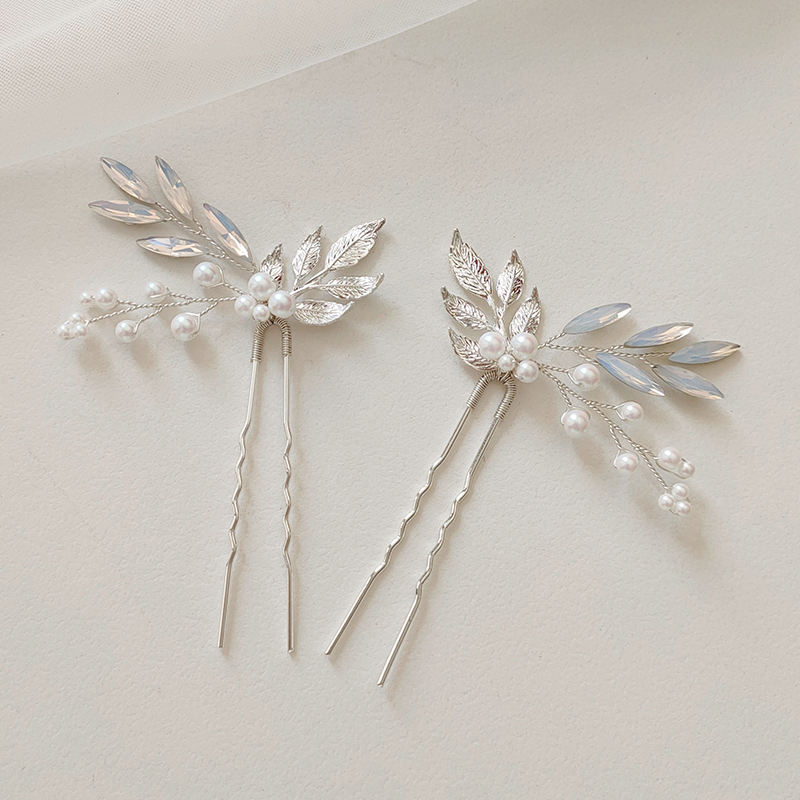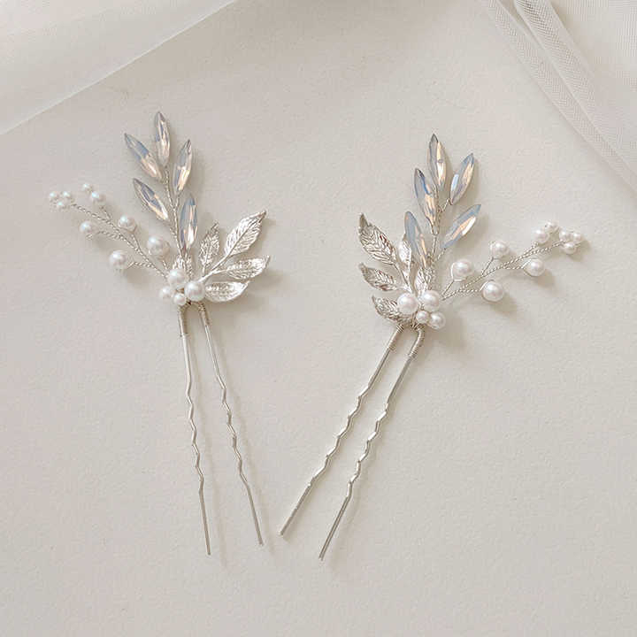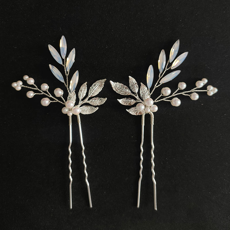 Nuevas horquillas hechas a mano para fiestas, bodas, accesorios para el cabello con perlas inidiscentes de ópalo de hoja de aleación para tocado de novia