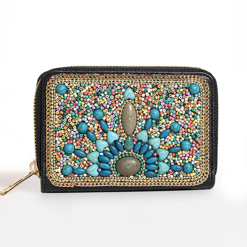 Nuevo estilo bohemio hecho a mano cuentas de arroz flores de mariposa exquisito bolso de tarjeta con cremallera de PU pequeño monedero bolso cuadrado femenino