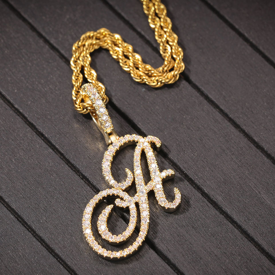 Nuevo Collar con Colgante de Letra Cursiva Iced Out del Alfabeto con Dijes de Circonita Cúbica en Color Oro y Plata, Joyería Hip Hop