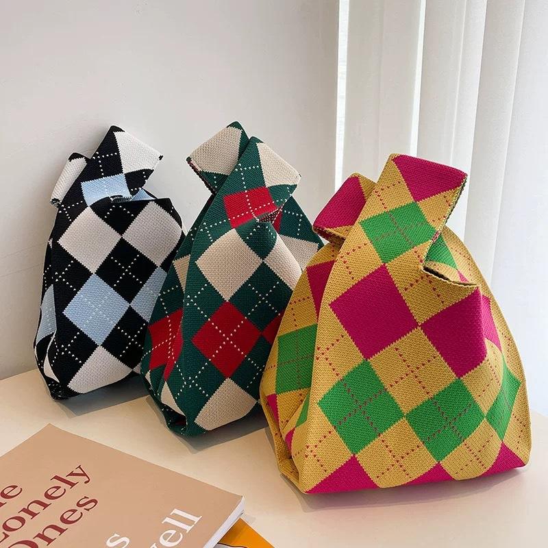 Nuevo Bolso Tejido con Patrón de Cuadrícula, Diseño Coreano de Moda con Bloques de Color