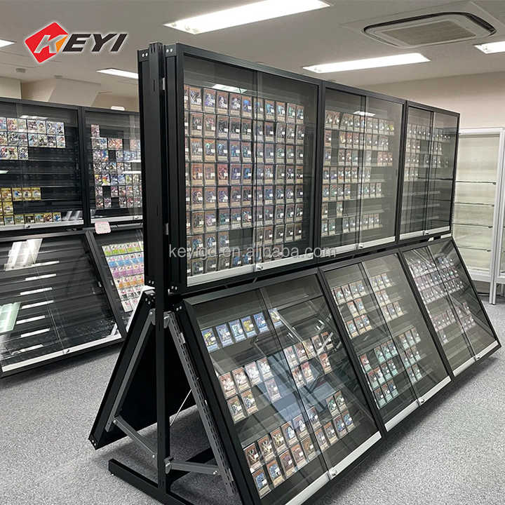 Nuevo expositor de gran capacidad doble cara para cartas TCG y coleccionables, vitrina metálica para uso en tienda
