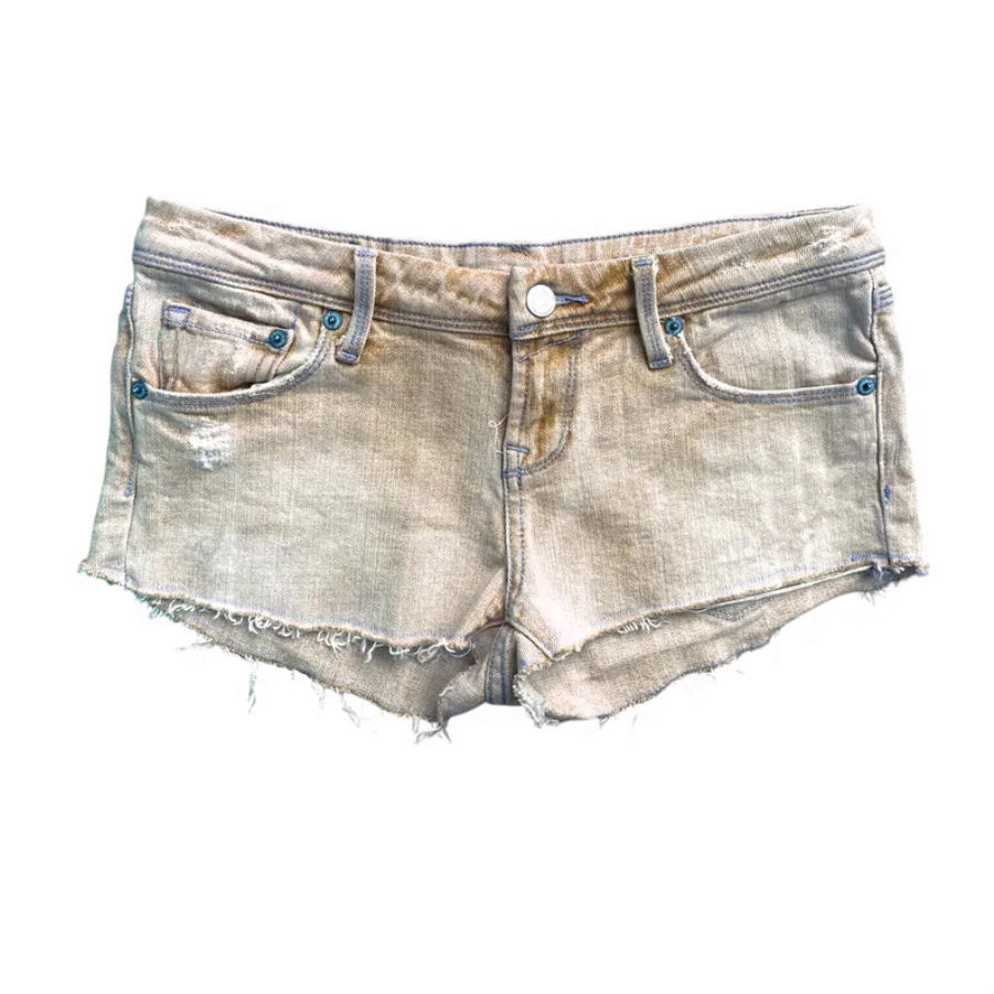 Pantalones cortos de mezclilla de tiro bajo para mujer de color caqui de algodón 100% de alta calidad y alta personalización con estilo desgastado