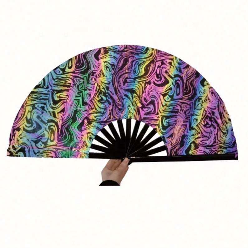 Nuevo Abanico de Bambú Iridiscente Láser Reflectante con Técnicas de Tallado para Festivales, Material Fantasía