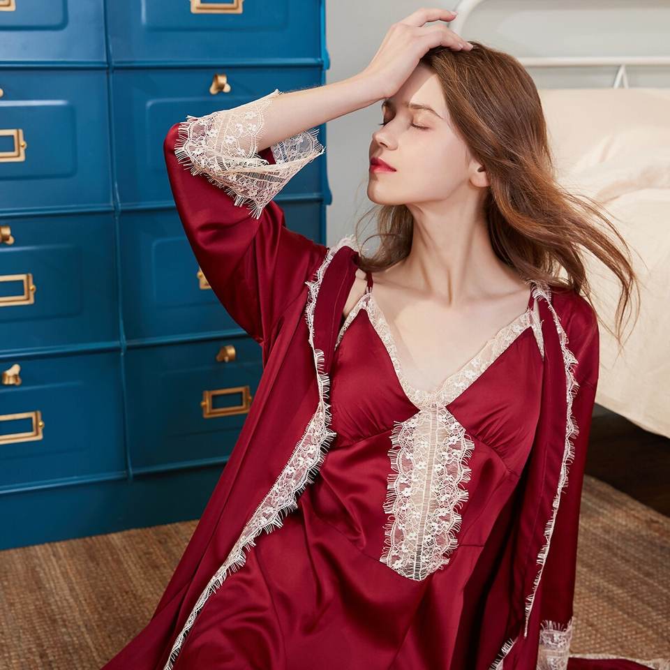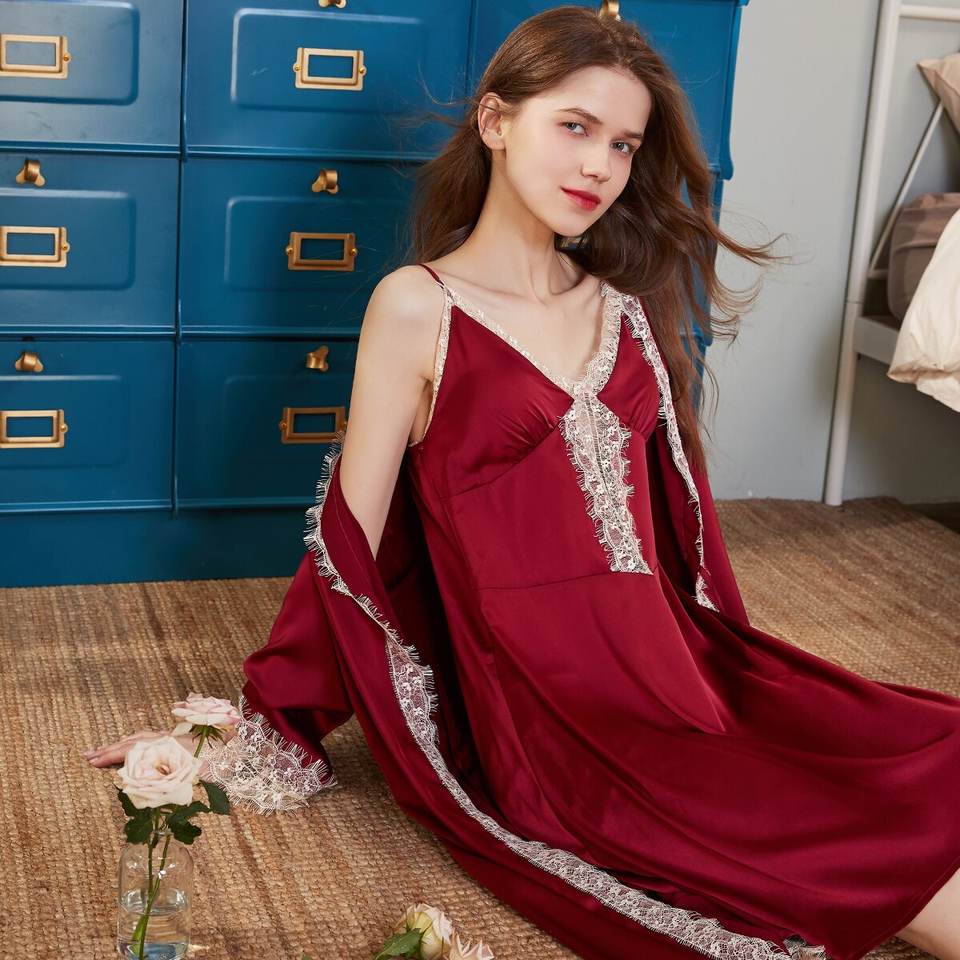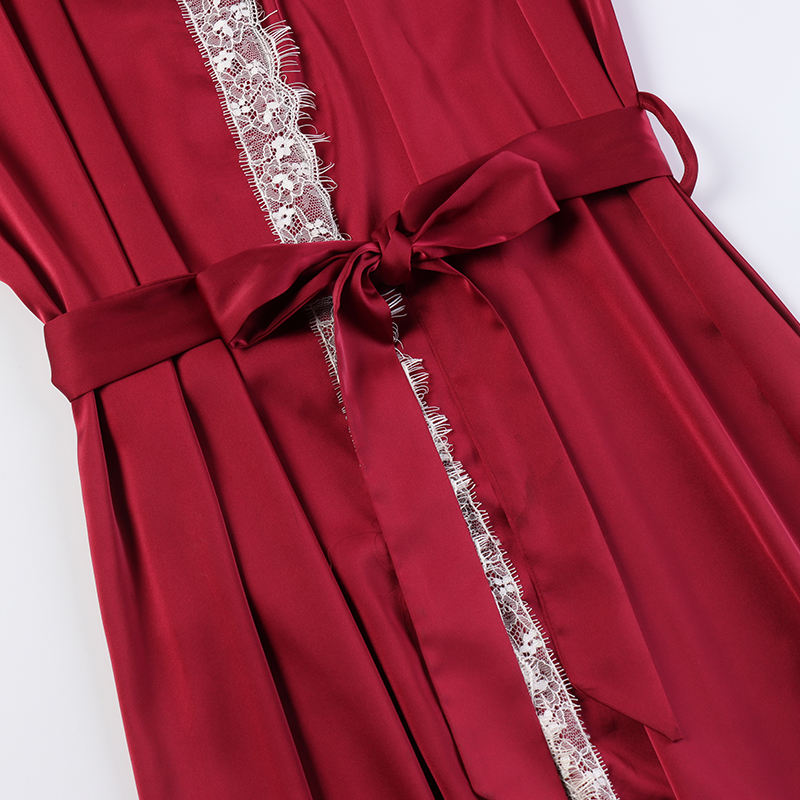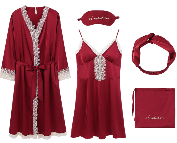 Nuevo Modelo, 5 Piezas, Bata de Satén Transpirable, Suave, con Encaje Rojo, Sexy, Lujosa, Elegante, Cintura Elástica, Logotipo Personalizado, para Mujer, Primavera y Otoño