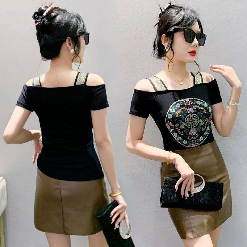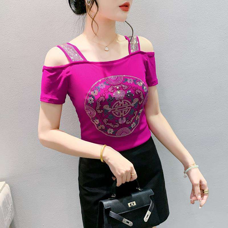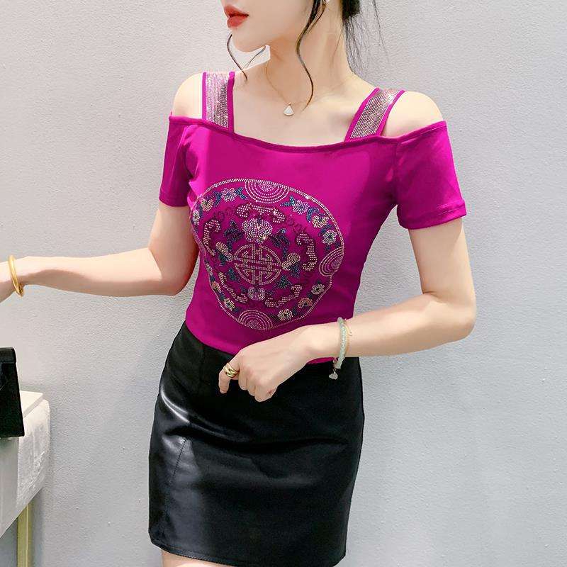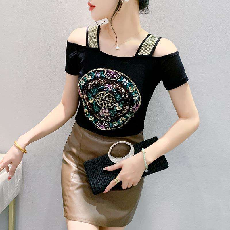 Nueva Camiseta Corta de Moda con Hombros Descubiertos y Espalda Estilizada, de Doble Capa de Malla de Seda Helada con Incrustaciones de Diamantes, Estilo Nacional