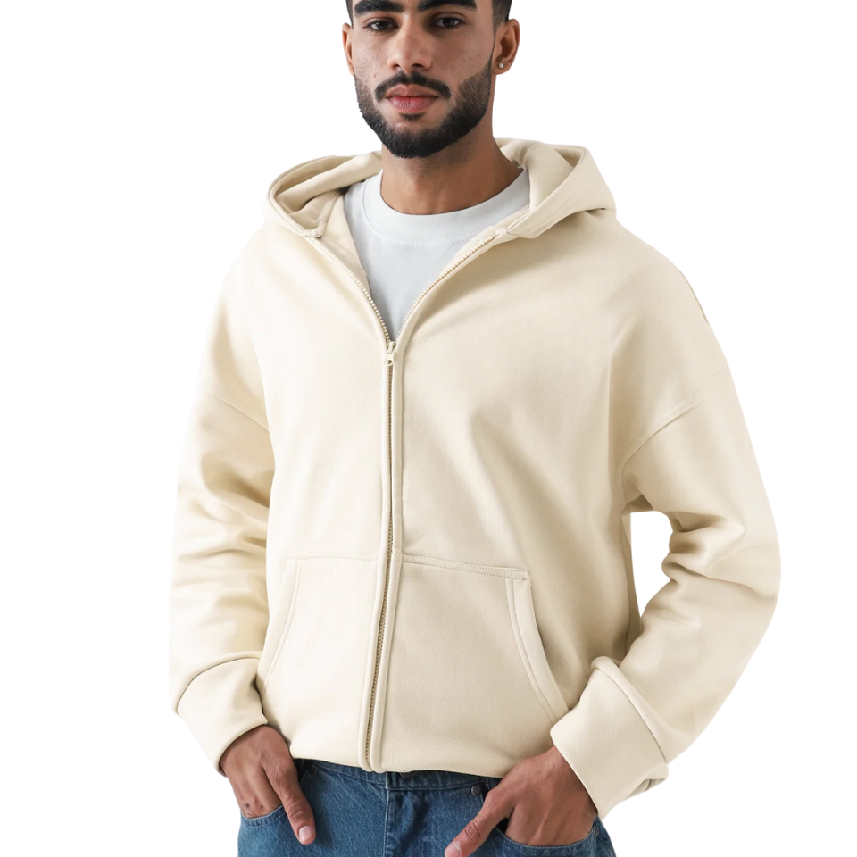Nueva Sudadera con capucha Premium Cream Zip Up Heavyweight 100% Cotton Fleece con diseños de hombros caídos y bolsillo de canguro para ropa de calle