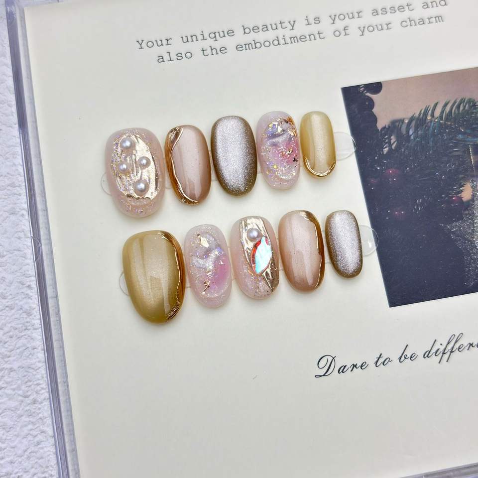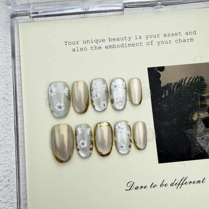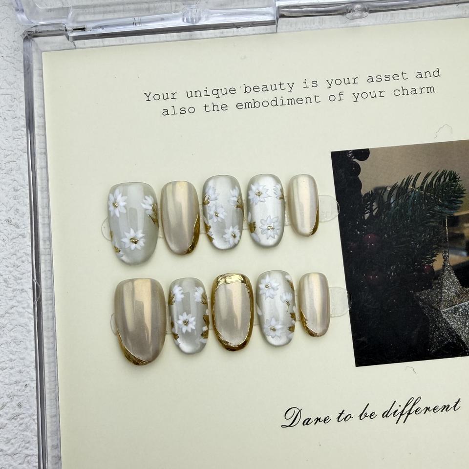 Nuevo Producto Lanzado, Uñas Postizas Hechas a Mano Estilo Ojo de Gato Transparente con Mini Margaritas Plateadas y Suavemente Doradas, Estilo Francés, para Primavera y Verano