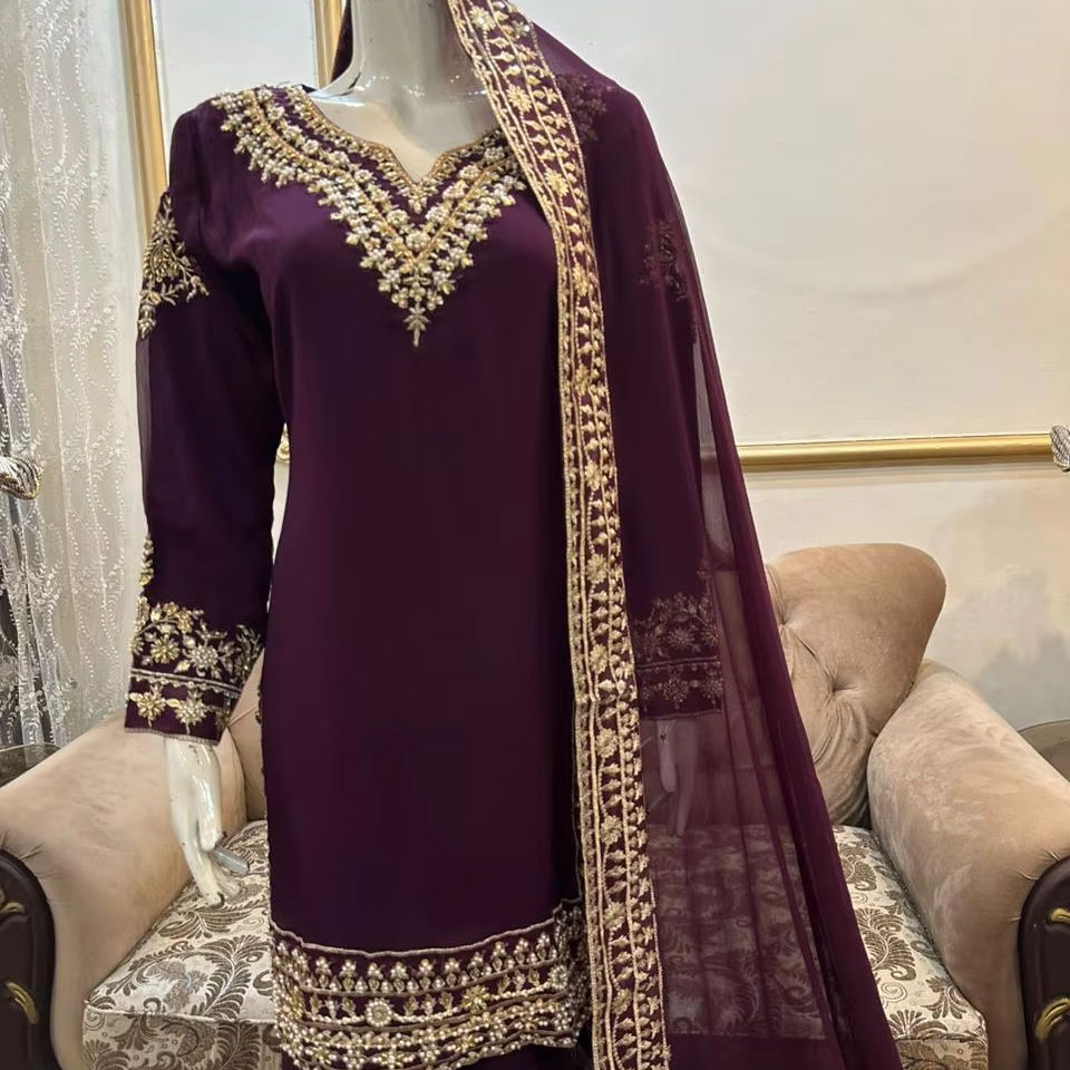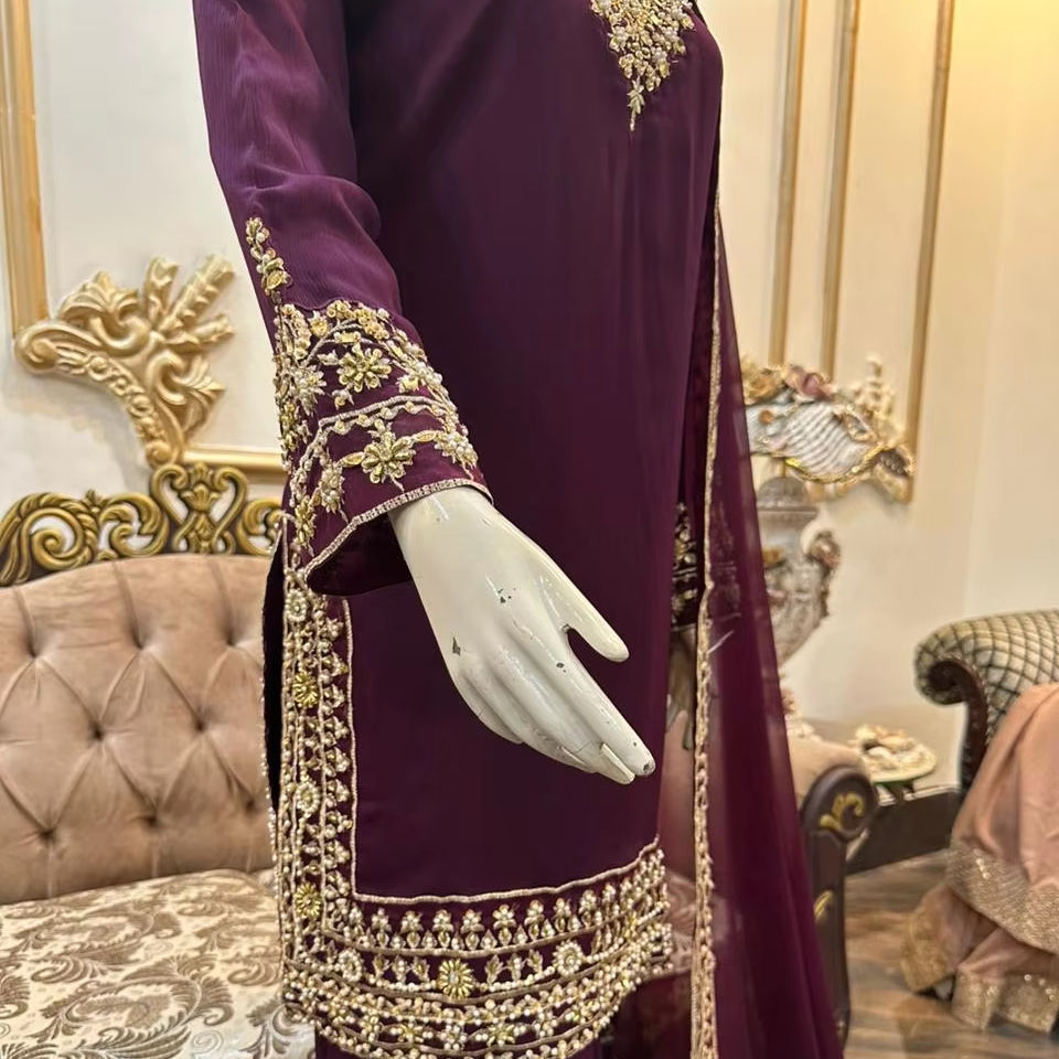 Nueva Camisa de Chifón Puro con Hermoso Trabajo Artesanal, con Hermosa Falda Gharara de Chifón y Dupatta con Bordes Bordados de Chifón