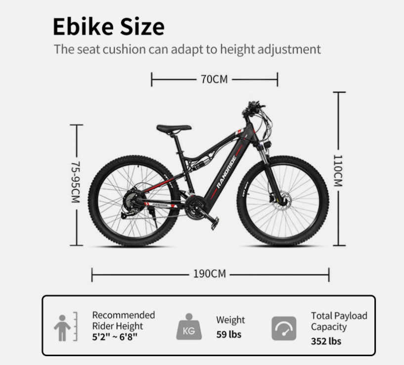 Nueva Bicicleta Eléctrica de Montaña RANDRIDE 60V 10.5AH 1000W para Adultos con Batería de Litio, Alcance de 60 km, Frenos de Disco Hidráulicos y Cuadro de Aluminio