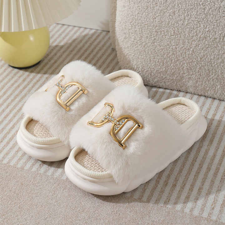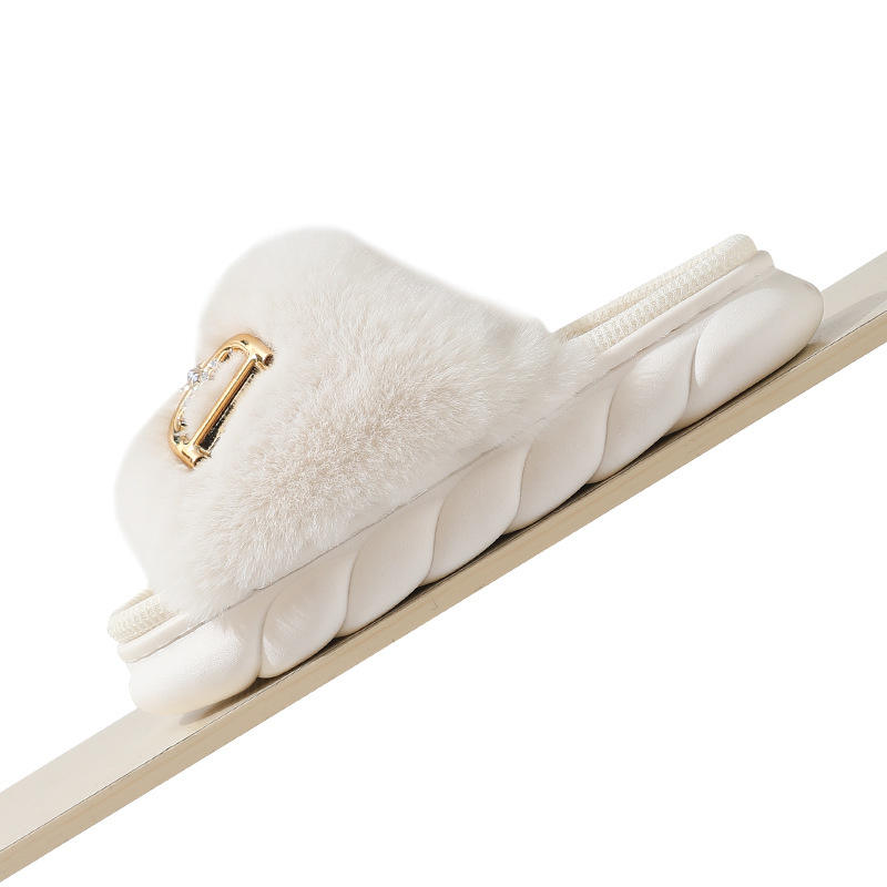 Nuevas pantuflas cálidas de lino con hebilla decorativa de piel de conejo para mujer, zapatos antideslizantes y a prueba de olores para el hogar de felpa para todas las estaciones Ins