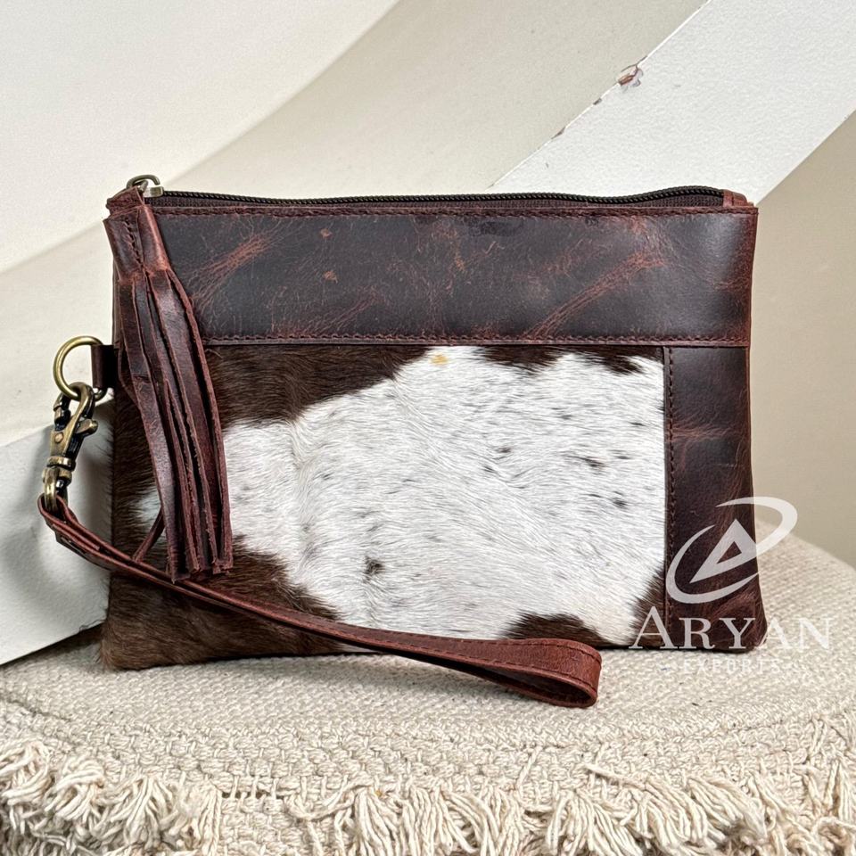 Western Hair On Hide Cartera de cuero genuino con borlas Cartera de cuero de vaca marrón oscuro Titular de la tarjeta de crédito Monedero de embrague para mujer