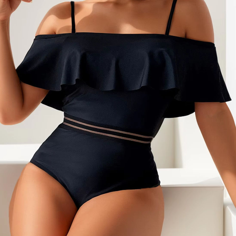 Nuevo Traje de Baño con Volantes, Sexy, de Cintura Alta, Bikini de Color Sólido, Traje de Baño de Una Pieza