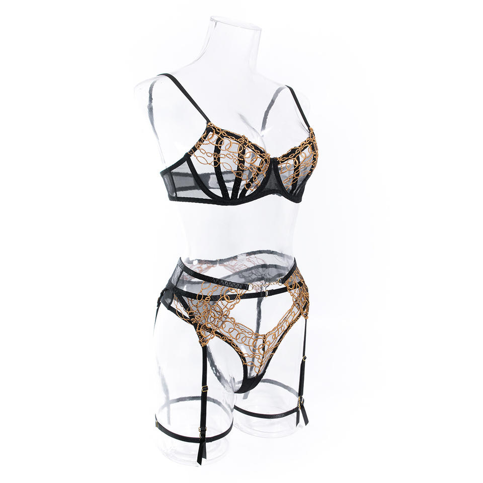 Nuevo Conjunto de Lencería Sexy Transparente con Bordado Ruso y Cadena, 3 Piezas