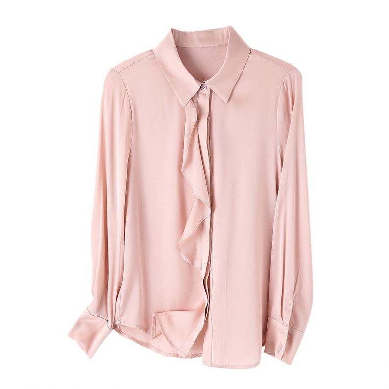 Nueva colección primavera 2025 de camisas de seda para mujer con diseño de volantes y botones simples