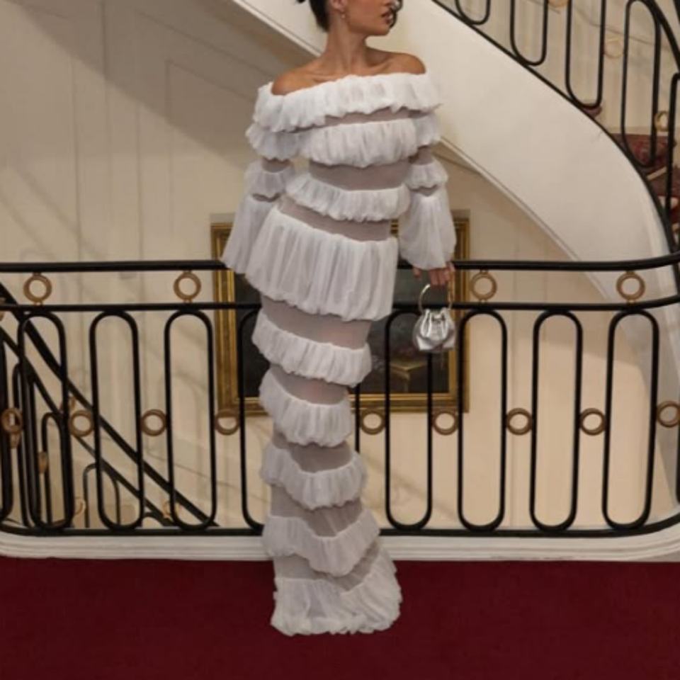 Nuevo Vestido de Noche de Gasa con Hombros Descubiertos, Estilo Princesa, Transparente, Maxi, con Volantes y Ajustado al Cuerpo, Colección Primavera