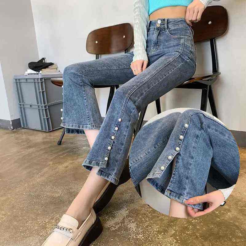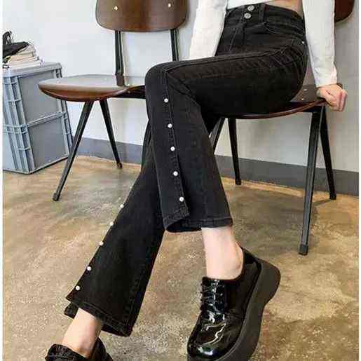 Nueva colección de primavera, pantalones vaqueros informales versátiles de cintura media para mujer, estilo frontal plano, tela de algodón transpirable, cuentas con abertura, 2017