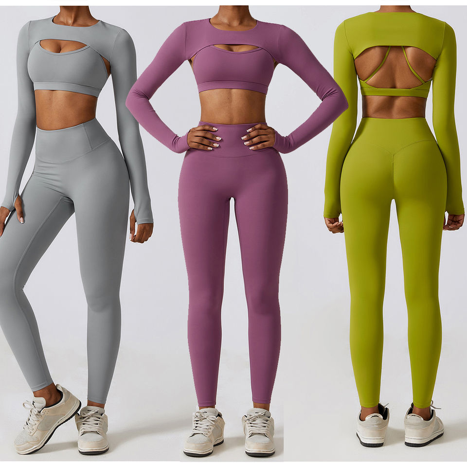 Nuevos conjuntos de Yoga de secado rápido de primavera para mujer, mallas de sujetador de manga larga, 3 piezas, entrenamiento de seda helada, deportes, Yoga informal, conjuntos de tres piezas para mujer