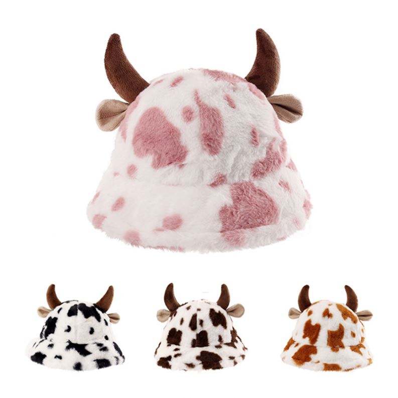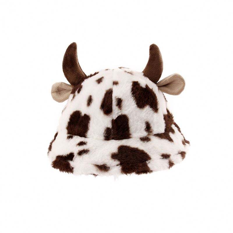 Nuevo estilo otoño moda Fuzzy moda vaca patrón estampado felpa pescador cálido grueso invierno cubo sombrero mujeres