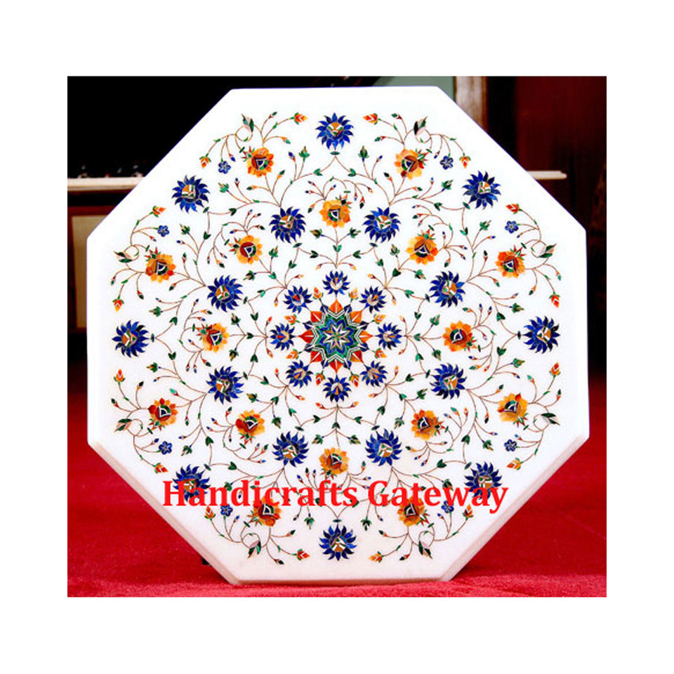 Tablero de Mesa Octogonal con Incrustaciones de Mármol Blanco, Diseño de Incrustaciones de Flores Hechas a Mano con Superficie Brillante, para Mesa de Centro en Restaurantes