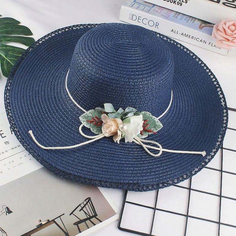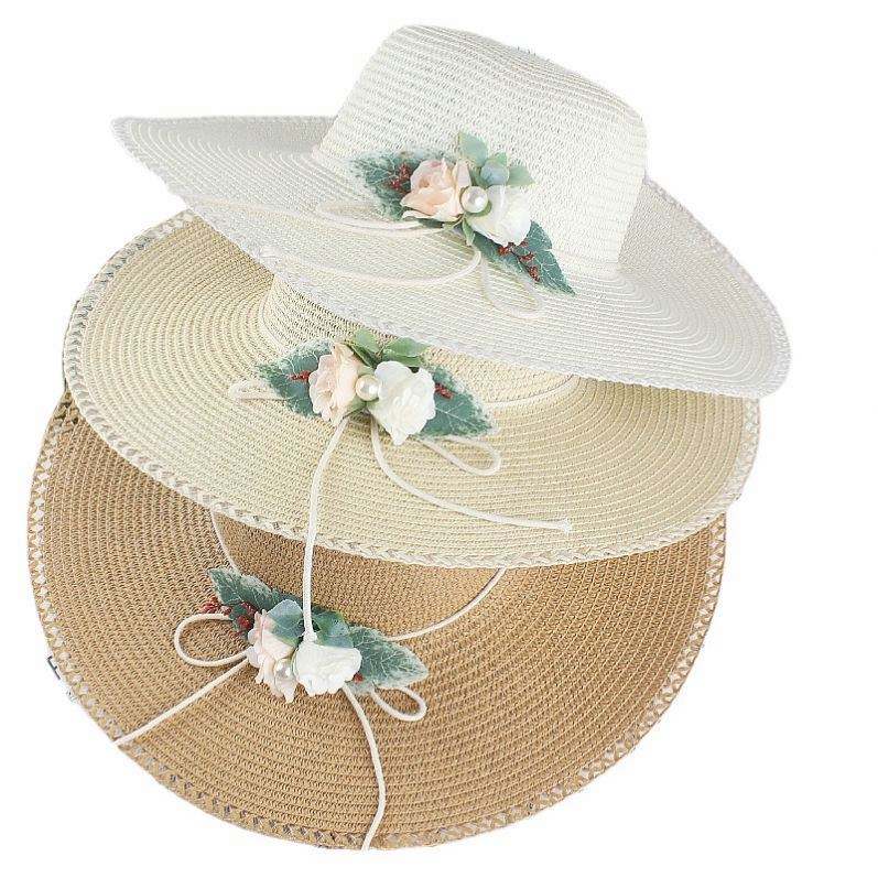 Sombrero de Paja de Ala Ancha para Mujer, Estilo Moderno, con Lazo de Flores Frescas, Protección Solar, para Verano y Playa