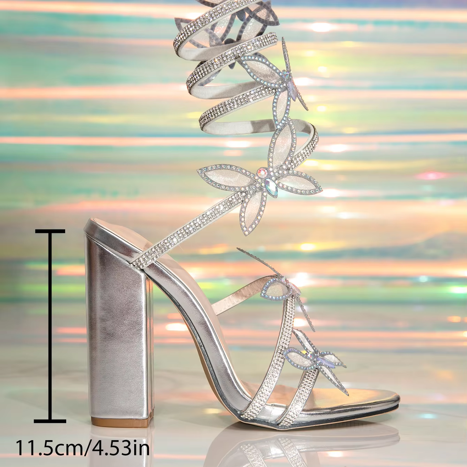 Sandalias de tacón súper alto con una sola correa, diseño de serpiente, punta abierta, lazo de diamantes de imitación y tacón grueso, estilo nuevo para mujer